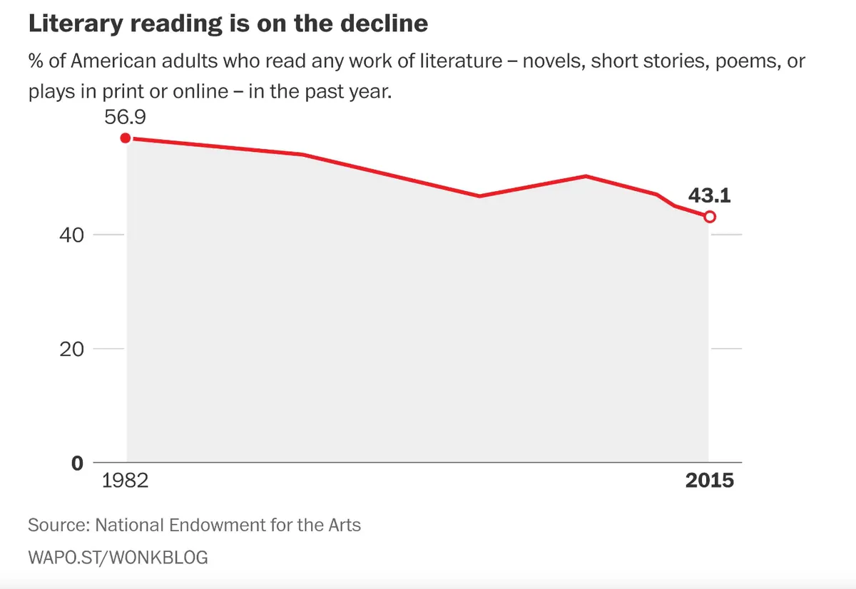 Q: Yes, something like that. So the real question is why aren’t we getting enough narrative nutrients? For one, we probably just aren't “eating” enough—Americans are reading fewer books (from 15.3 per year in 1991 to 12.6 in 2021 according to a Gallup poll) and less literature than ever before.