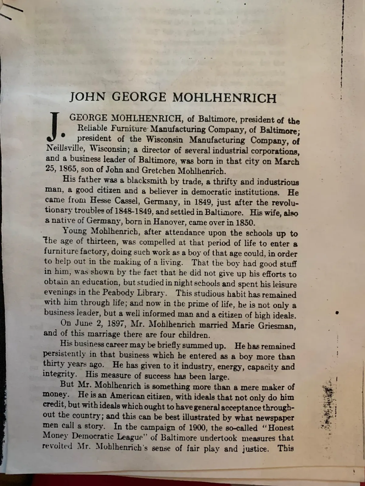 “…This League brought to bear upon the employers of labor arguments to induce them to force their employees into line with the views of the League. Finally, they set a day for a great parade, and circular letters were sent out to the large employers asking them to have their men in line. It was calmly assumed that the views of the men were of no importance whatever, and that it was simply & matter for the employers to instruct them to enter the parade. Mr. Mohlhenrich's company received the usual invitation, and it was shown that quite a number of employers had promptly accepted the invitation. The cotton duck trust, the tobacco trust, the Baltimore and Ohio Railroad, the South Baltimore Car Works, the Maryland Steel Company, and other large employers, agreed to have their men in line. Mr. Mohlhenrich received under the date of October 31, 1900, the usual letter sent to the other employers. He replied with a letter which was as effective as a two thousand pound shell in warfare (emphasis mine). As he says himself, the letter was not written from any partisan standpoint, and would have been sent to the opposite party committee if their actions had called for it. It was the assertion of independence on the part of an American citizen, and the further assertion that his employees had a right to their opinions, and that no man could dictate to them. As the best possible exposition of the character of J. George Mohlhenrich, the letter here appears in full: and this letter. will explain why he enjoys the standing he does in the city of Baltimore: